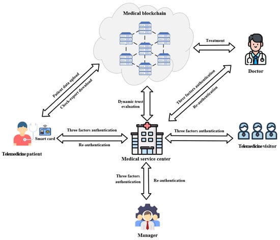 The overall architecture of this solution is shown in Figure 1. In this system, a Fabric consortium blockchain is adopted to implement the blockchain-based data-sharing platform. The uploading, querying, and updating of authentication information are achieved through the deployment of smart contracts. The medical service centers, medical sensors, etc., serve as participants to form a collaborative consortium of the blockchain network, leveraging the distributed ledger technology of blockchain to break the medical information silos. Entities interact with each other via secure communication protocols to jointly complete the identity authentication and management of telemedicine users, ensuring the security and integrity of information transmission. The proposed system model mainly includes the following types of entities: