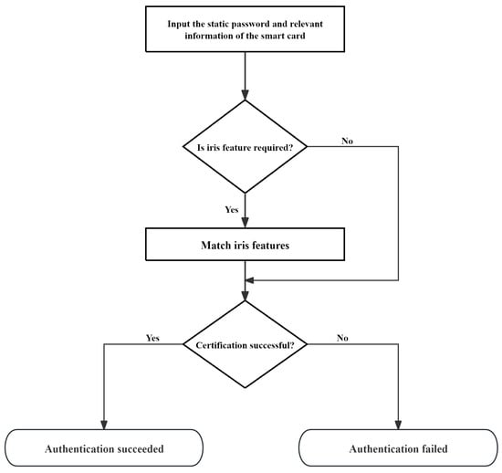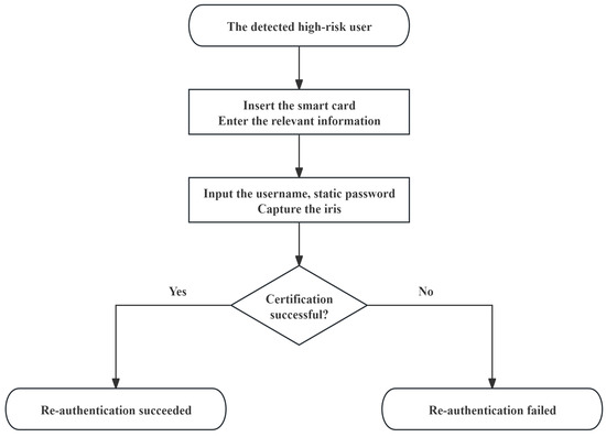 The uniqueness and difficulty in counterfeiting iris factors make it difficult for attackers to impersonate the iris characteristics of legitimate users. Iris recognition technology usually has high accuracy and security and can effectively distinguish the iris features of different users. The secure storage and encryption features of smart cards ensure that the data in the smart card cannot be easily stolen or tampered with. Smart cards can store important data such as users’ authentication information and keys and protect these data through encryption algorithms, which can only be decrypted and accessed by having the correct key. The encrypted transmission and verification of the static passphrase increases the difficulty for the adversary to obtain the static passphrase. The static passphrase is encrypted during transmission and is verified by comparing it with the hash value stored in the system to ensure the accuracy of the passphrase. In addition, the re-authentication mechanism further enhances the security of the system, guaranteeing that only legitimate users can pass the authentication. The re-authentication mechanism further ensures the legitimacy of the user’s identity by enforcing the re-authentication of untrustworthy users in the case of abnormal user dynamic trust evaluation.