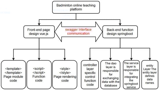 The main body of the AI referee assistance system based on the Harmony OS platform was named a “badminton online teaching platform”. It is divided into two parts, as shown in Figure 1. Firstly, the construction and improvement in the online badminton teaching platform. Secondly, the design and development of the AI referee assistance system based on deep learning. The overall design diagrams of the two systems are shown in Figure 1 and Figure 2. This study employed SpringBoot to build the entire backend framework for web pages, Vue to develop the frontend using the uni app framework for mini-programs and utilizes AJAX technology and Swagger 2.0 to achieve frontend and backend separation. In addition, MySQL 8.0 was used as the database and combined with Navicat 13 visualization tools for database design.