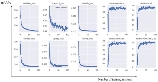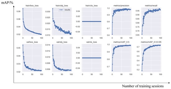 In the object detection module, this study still uses the Yolov5 algorithm to build an object detection network. By collecting more than 2000 relevant images as a dataset, the images are fed into the object detection model for training through data annotation and dataset partitioning. The model parameters and iteration times are adjusted multiple times to complete the model training, and the optimal model is selected for testing and validation to examine its object accuracy. The training process of its model is shown in Figure 8.