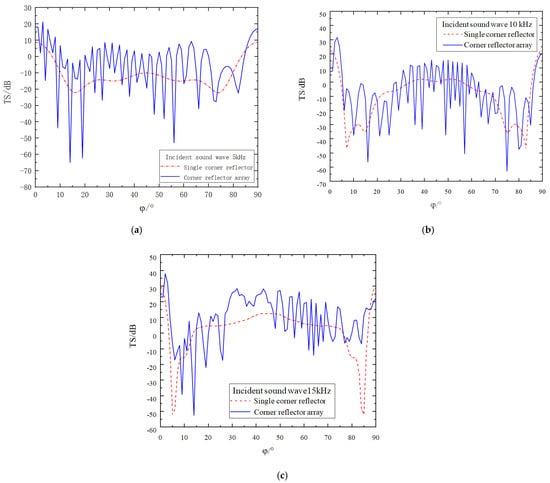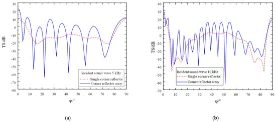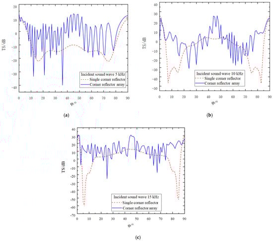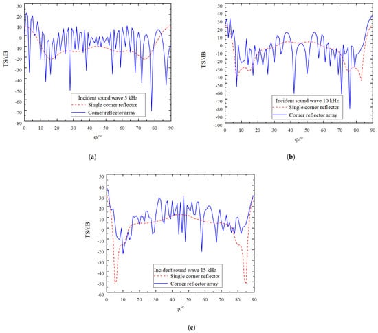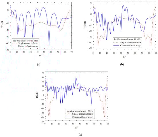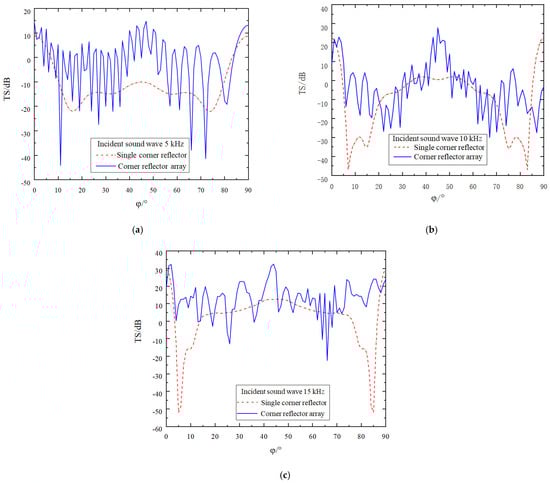 - As the number of corner reflectors increases, the relative cross-sectional area of the reflecting surface correspondingly expands, resulting in a significant increase in the target strength. By calculating the target strength at each sampling point, it is found that when the frequency of the incident acoustic wave is 5 kHz, the target strengths of the single corner reflector and the corner reflector array are −10.9 dB and −8.2 dB, respectively. At 10 kHz, the target strengths are −9.3 dB and −6.3 dB, respectively, and at 15 kHz, the target strengths are 2.1 dB and 4.4 dB, respectively.
