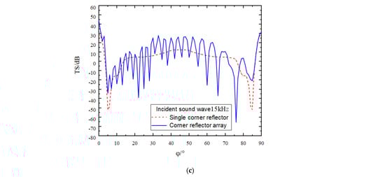 - After calculating the target strength at each sampling point, it is found that when the incident acoustic-wave frequency is 5 kHz, the average target strength of the corner reflector array is −3.2 dB. At 10 kHz, the average target strength is −2.0 dB, and at 15 kHz, the target strength is 11.6 dB.