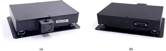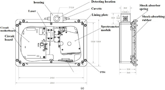 The miniaturization transformation of the Raman spectrometer is carried out independently in this paper. The front and back views of the self-developed Raman spectrometer are shown in Figure 1a,b. The instrument has been designed in proportion to reduce its size to 230.0 mm × 150.0 mm × 54.0 mm. As shown in Figure 1c, the internal design of the self-developed Raman spectrometer has been improved by the miniaturized design of the internal structure, using a 785 nm laser as the light source and a resolution of 3 cm−1. The maximum power is 340 mW and adjustable. The instrument is compact in size and has a simple optical path structure, making it easy to upgrade, modify, and integrate for subsequent designs. The Raman spectrometer consists of three parts: a laser, a spectral spectroscopic receiving system, and a Raman probe. The laser spot size is in the millimeter range, and signal collection is carried out through optical fibers with an integration time of 10 s. The correction method is to place the standard sample at the measurement position of the spectrometer, ensuring that the light spot is aligned with the surface of the sample. We then compare the deviation between the measured peak position and the standard peak position (the Raman characteristic peak of the silicon wafer is located at about 520 cm−1, and the wavenumber offset needs to be adjusted). Input theoretical values through the calibration tool in the spectrometer software, and the system automatically or manually adjusts the wavenumber offset. Calibrate once before each experiment, and do not calibrate for consecutive experiments.