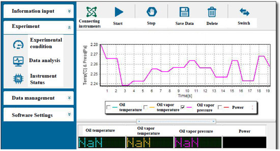 The micro-distillation instrument software directly controls the instrument using an upper computer. The software controls the operation of the micro-distillation instrument, achieving four main functions: establishing a distillation range experimental plan, controlling the distillation range experimental process, collecting distillation range experimental data, and calculating and analyzing distillation range experimental results. The main interface of the Micro-Distillation Instrument software (MicroDistillAnalyzer_v1.0_setup) is shown in Figure 4.