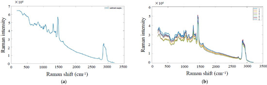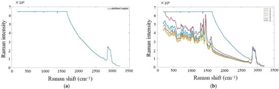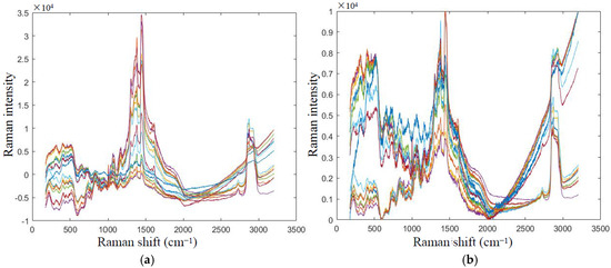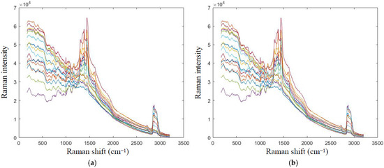 The data processing results of this joint detection system are shown in Figure 6. Figure 6a shows the original Raman spectra of 14 diesel samples, from which a small number of burrs can be observed. With reference to a literature comparison [27,28], the results of this experiment conform to the characteristics of Raman spectroscopy. The result of smoothing the spectrum using the Savitzy–Golay smoothing method is shown in Figure 6b. The characteristic bands of the processed spectral lines are clearer, smoother, have fewer burrs, and are easier to analyze. The results confirmed that Savitzy–Golay smoothing data processing is suitable for this contact detection system.