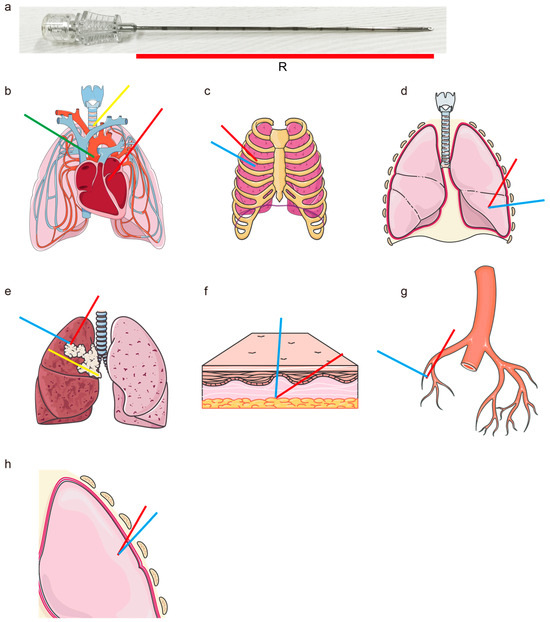 Figure 1. Illustrative examples of rigid needle path planning considerations in percutaneous interventions. (a) Needle Rigidity Assumption: A photograph of a biopsy needle. In clinical practice, any deformation of the needle during puncture is typically disregarded, assuming a rigid, linear trajectory within the tissue. The red line indicates the effective working length (R) of the needle. (b) Critical Organ and Tissue Avoidance: Trajectories are shown with various colors; the red path traverses the heart, the green path violates major blood vessels, and the yellow path penetrates the trachea. Each of these trajectories is contraindicated. (c) Bone Avoidance: The red path punctures the rib inappropriately, whereas the blue path successfully avoids bony structures. (d) Lobe-Specific Targeting: The red path, intended for the left lower lobe, undesirably crosses into the left upper lobe, causing unintended damage and increasing the risk of pneumothorax. In contrast, the blue path remains confined to the left lower lobe, representing a preferable trajectory. (e) Path Length Constraints: An irregular white shape denotes a tumor. The yellow path exceeds the effective length R of the needle, rendering it physically infeasible since it would necessitate the tail of the needle remaining inside the body. Moreover, the red path, being significantly longer than the blue path, suggests greater tissue trauma, and is suboptimal compared to the shorter blue path. (f) Skin Entry Angle: The red path features an excessively oblique skin entry angle, while the near-perpendicular blue path represents a more favorable approach. (g) Major Vessel Avoidance: The blue path selectively traverses only minor vessels, making it acceptable. Conversely, the red path intersects multiple major blood vessels; thus, it is contraindicated. (h) Distance from Critical Structures: A schematic illustrates that the red path offers insufficient distance from the rib, posing a higher risk in clinical practice, whereas the blue path maintains a safer margin. - Avoidance of Vital Organs/Tissues: The path must avoid the heart and major blood vessels to prevent severe complications (Figure 1b).