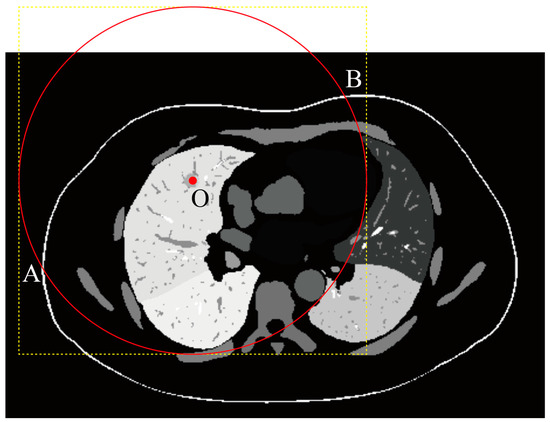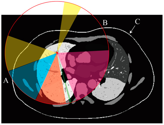 Figure 2 presents a 2D cross-sectional view of a region containing potential puncture paths. Grayscale values indicate the segmentation labels for different organs or tissues. The red point marks the puncture target, and the red circle represents a sphere with a radius corresponding to the length of the biopsy needle (R). Feasible puncture paths are constrained to lie within the region between points A and B, ensuring that the needle can reach the target. The colors represent various constraints: yellow indicates feasible areas, blue indicates areas obstructed by the rib, orange denotes regions where the needle would cross multiple lung lobes, green signifies insufficient needle length, and pink highlights areas blocked by the heart or major arteries. Point C and the white arrow indicate the skin mask, while points A and B mark the intersections of the red circle with the skin surface.