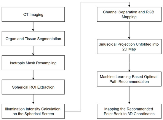 To address these critical challenges, this study proposes and validates a precise and rapid rigid needle path planning method for robot-assisted percutaneous puncture. In recent years, the rapid advancement of graphics processing unit (GPU) technology and computational lighting simulation techniques—such as the NVIDIA® OptiX (NVIDIA Corporation, Santa Clara, CA, USA) engine, which leverages CUDA® (NVIDIA Corporation, Santa Clara, CA, USA) for efficient ray tracing—has dramatically accelerated computational processes [38]. Leveraging the principle that light travels in straight lines, analogous to rigid needle trajectories, we hypothesized that optical principles could be effectively applied to needle path planning for enhanced computational efficiency and precision. The omnidirectional propagation of light in 3D space further mirrors the clinical scenario of fixing a target and searching for an optimal entry point in three dimensions. Inspired by this analogy, our approach frames lung puncture path planning as an optical illumination computation task. This study introduces two key improvements to address the challenges of rigid needle path planning in robot-assisted percutaneous puncture: