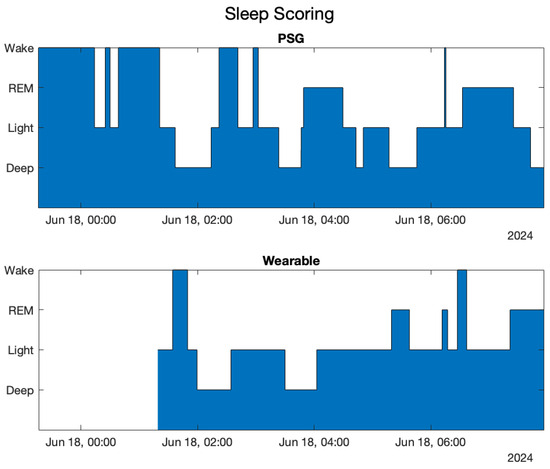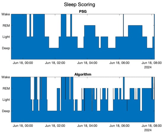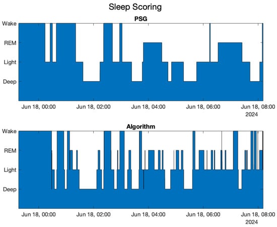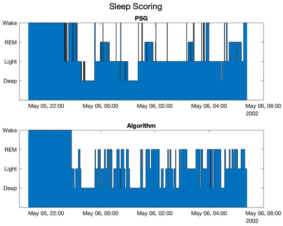 26]. To fix these problems, there has been a growing interest in wearable devices such as smartwatches and smart rings, whose sensors have improved greatly in recent years and which enable remarkable results in sleep estimation. The problem addressed in this work is to create an algorithm for on-the-fly scoring, but one that can be used with wearable devices. Then, data were collected from wearable devices, and a Matlab algorithm was written to take input from the collected data and calculate the scoring. PSG was used as ground truth, as it is the most accurate technology for sleep scoring. A comparison of the results was made, and the following was determined.