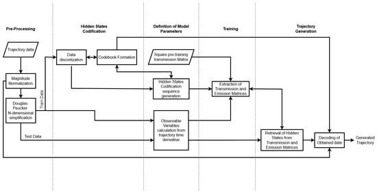 Figure 1 outlines the step-by-step methodology for processing data in the study. It begins with trajectory data generation, followed by a normalization by magnitudes to ensure the homogeneous treatment of the data. Next, it undergoes feature extraction through the Douglas–Peucker simplification to identify key parameters. The extracted features are then fed into a machine learning model and trained using hidden Markov models to learn complex patterns from the data. This stage includes defining the transition and emission matrices. Finally, the system outputs the predicted states to be decoded into the proposed trajectory.