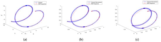 The example in Figure 2a shows a spiral trajectory that moves a distance of 20 units along the X-axis (from to 10), while on the Y-axis (from 0 to 10) and the Z-axis (from to 5), it moves only 10 units. When calculating the characteristic points without applying normalization, the result is shown. However, when normalizing by vectors, a similar displacement is observed across all axes, thereby altering the selection of characteristic points (Figure 2b). Therefore, normalization by magnitudes (position, velocity, force, etc.) has been chosen, as shown in Figure 2c, to ensure the correct scaling of the trajectory.