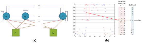In this article, a discrete HMM was implemented, making it necessary to map the continuous trajectories into a sequence of discrete values. A graphical representation of an HMM is shown in Figure 4a, where hidden states are denoted with and the observable variables are denoted by .