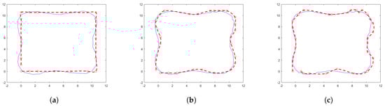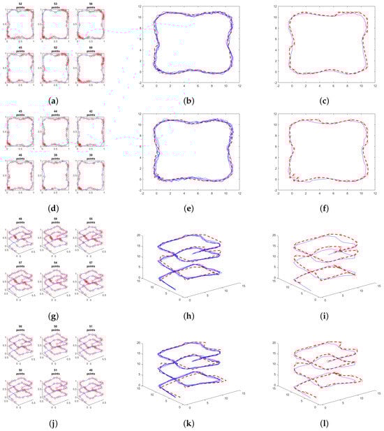 The results obtained for trajectories in a three-dimensional space are shown in Figure 5g–l. The learning process was executed using a three-dimensional training dataset with only the trajectory coordinates (Figure 5g–i) and a six-dimensional dataset that included position and velocity data (Figure 5j–l). In this example, the original training trajectory consists of a square displaced along the Z-axis, forming a spiral composed of 71 points with variable velocity.