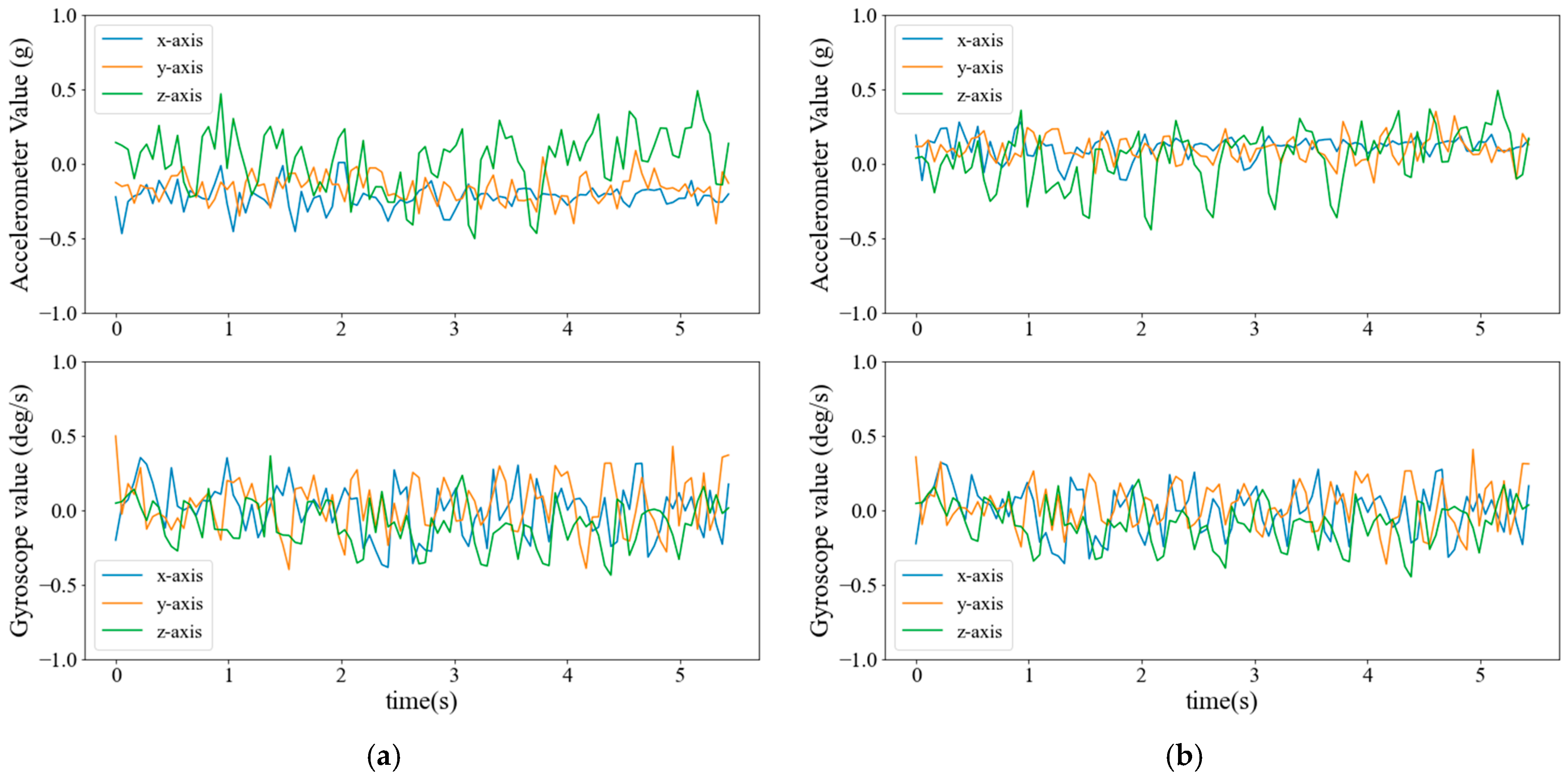 Accelerometer and gyroscope signals from the ADL events. (a) Real; (b) Synthetic.
