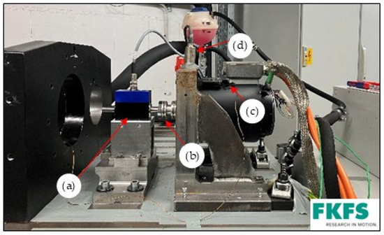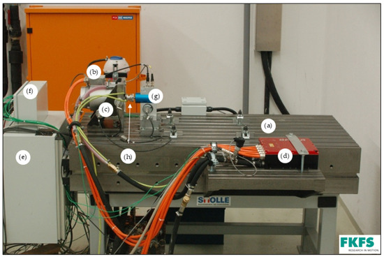The tests are carried out on a drive test bench at the Research Institute for Automotive Engineering and Powertrain Systems Stuttgart (FKFS). This is shown in Figure 1. The test bench has a modular design and consists of a vibration-insulated clamping plate (a), the electric drive unit (EM (b), mounting bracket (c) and inverter (d)), as well as a connection cabinet (e) and measurement rack (f). In addition, a torque measuring shaft (g) is installed to which the device under test (DUT) to be tested is mechanically connected. The drive power is transmitted via a metal diaphragm coupling (h) in high-speed design. This compensates for shaft misalignments in the axial and radial directions as well as angular misalignments. The test bench used is a newly installed development test bench for high-speed EMs. On this test bench, the mechanical, thermal and hydro-dynamic properties of EMs can be analysed at very early stages of development. The special feature of the test bench is that the DUT itself does not have to generate any torque for the drive. Instead, the DUT is towed by the test bench machine and, therefore, does not require any electromagnetic components or power electronics. Speeds of up to 24,000 rpm are possible with this machine. With the help of automation technology, measurement data of up to 4 kHz can be generated in MDF 4.0 format in real time. Thanks to automation technology, a fully automated test drive is possible. This enables tests such as ageing properties or cycle testing. Heat input and heat dissipation can be precisely determined using water or oil conditioning.