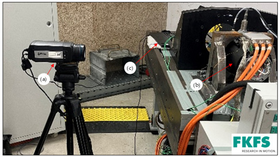 Figure 2 and Figure 3 shows the test bench setup. The thermal imaging camera is positioned next to the test bench machine at a distance of 1 m so that the measuring range covers the entire machine. The thermal imaging camera is connected to a laptop, which records the measurements. In addition, two type K thermocouples are attached to the surface of the motor housing to calibrate the camera. A vibration velocity sensor is mounted on the support to protect the EM and the test bench. This monitors the vibration velocities so that they do not exceed a defined level and serves as protection against mechanical damage to the drive unit and measurement technology caused by excessive vibration velocities.