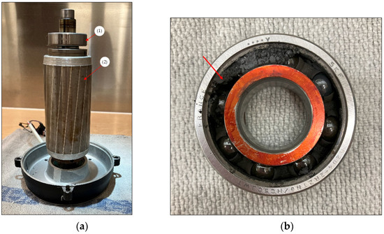 To generate the infrared images, reference measurements are first carried out with an intact motor and cooling. For the tests with bearing damage, the rotor is dismantled, as shown in Figure 4. The bearing (1) is removed from the rotor (2) and replaced with a damaged bearing. Sand is filled into the bearing, which is intended to synthetically recreate a damaged bearing so that lubrication is no longer provided, as shown in Figure 4b. The bearing is then pressed back onto the rotor and installed in the EM.