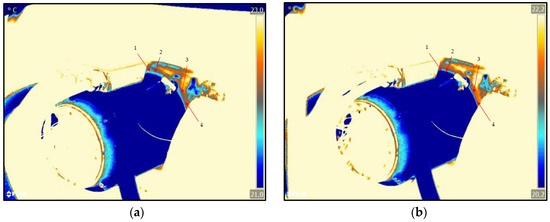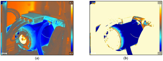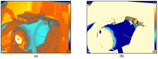 Figure 5b and Figure 6b show that the heat propagation along the end shield is now visible. The friction losses of the bearing are transferred to the end shield in the form of heat, which is shown here by the red pixels. In a direct comparison of Figure 5b and Figure 6b, however, no significant differences can be recognized; therefore, the bearing damage cannot be determined. Without further analysis using the software, the difference between the intact and the damaged engine is not apparent to the test bench engineer. The difference in colour in the individual pixels cannot be seen with the human eye. However, as each pixel is assigned a temperature, each pixel must be analysed separately in order to determine the temperature difference.