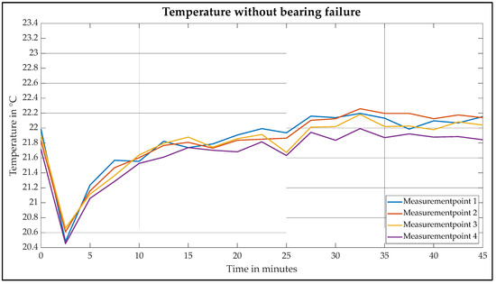 Figure 8 shows the temperature curve of the intact motor. The abscissa represents the time course of the measurement over 45 min. The ordinate describes the measured temperature. A temperature of 21.8 °C is determined at the start of the measurement. As the ambient temperature is greater than 20 °C over the entire measuring range and the motor housing is warmed up by the ambient temperature, the temperature initially drops to 20.5 °C due to cooling. The temperature of all measuring points then begins to rise.