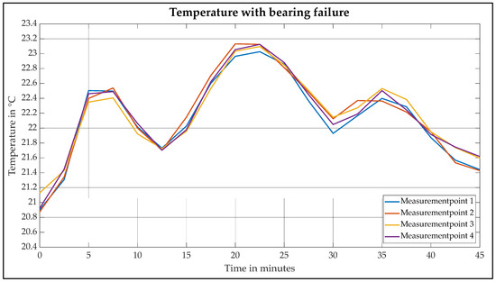 Figure 9 shows the temperature curve of the motor with bearing damage. The abscissa shows the course of the measurement over 45 min. The ordinate describes the measured temperatures. In contrast to the intact motor, however, the temperature does not rise continuously until thermal equilibrium is reached but fluctuates over the course of the measurement. The curves of the four measuring points are very similar. For this reason, the curve of the first measuring point is described in more detail below as an example.