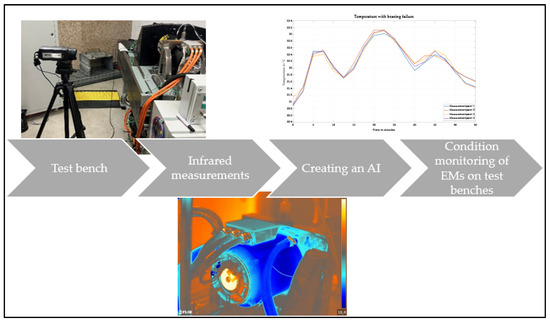 The diagnosis of faults in EMs using thermography has been used for a number of years. Thermography is of particular interest for detecting damage to EMs on test benches due to its non-contact temperature monitoring. Another reason for the use of thermography on test benches is the large number of measuring points. This allows for not only the thermal monitoring of individual components but also the entire test bench structure.