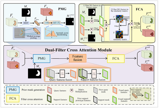Figure 2. Firstly, we input the support features, query features, and support mask into the prior mask generation (PMG) block to obtain a prior query mask. Then, to reduce the disparity between the FG features of support and query images, we fuse the support features