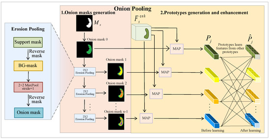 Specifically, we use the proposed EP operation to erode the support mask, creating layer-by-layer onion masks that prepare for extracting prototypes. Then, we conduct the MAP method to generate prototypes. Finally, we employ a self-attention-based method to enable mutual learning within the prototypes. This process is illustrated in