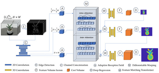 - Cao, C.; Ren, X.; Fu, Y. MVSFormer: Multi-view stereo by learning robust image features and temperature-based depth. arXiv 2022, arXiv:2208.02541. [Google Scholar]