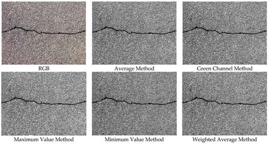 RGB images achieved the highest mAP@0.5 value of 0.222, confirming that color-based texture information is essential for YOLOv8s’s feature extraction. The minimum value method in grayscale achieved an mAP@0.5 value of 0.269, outperforming RGB. This suggests that enhancing darker regions may improve crack visibility. Other grayscale methods showed variable performance, with the weighted average method performing worse than expected (mAP@0.5 value of 0.229).