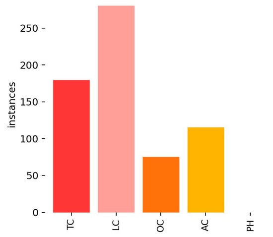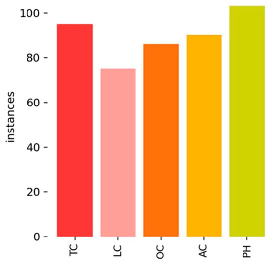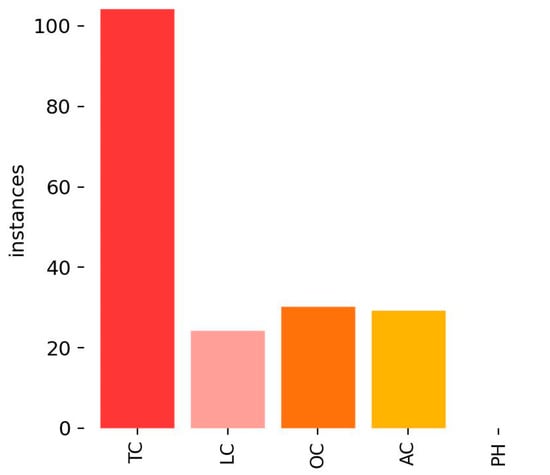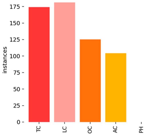 Figure 14 illustrates the distribution of crack labels in the CrackTree200 dataset. Similarly to CFD and Crack500, TCs and LCs (longitudinal cracks) dominated the dataset, which led to class imbalance. This imbalance may cause the model to favor these categories while reducing recall for underrepresented crack types such as ACs.