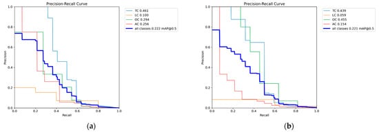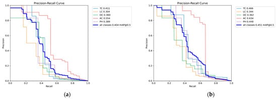 Figure 15a (Precision–Recall curve for RGB images) reveals that the TC and LC categories exhibited higher detection accuracy, which is likely due to their dominant representation in the dataset.