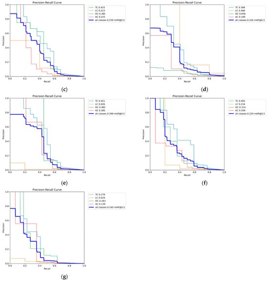 Precision–Recall curve of CrackVariety dataset. (a) Precision–Recall curve for RGB images, (b) Precision–Recall curves for Average Method grayscale images, (c) Precision–Recall curves for Green Channel Method grayscale images, (d) Precision–Recall curves for Maximum Value Method grayscale images, (e) Precision–Recall curves for Minimum Value Method grayscale images, (f) Precision–Recall curves for Weighted Average Method grayscale images, (g) Precision–Recall curve for binarized images.