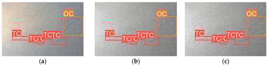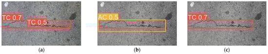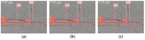 Figure 11 illustrates the distribution of crack labels in the Crack500 dataset. The dataset exhibited a noticeable class imbalance, where LCs were the most dominant category, followed by TCs. The significant disparity in crack type distribution may influence the model’s ability to generalize across all categories.