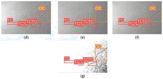 This confirms that dataset imbalance significantly impacts detection performance, as excessive bias towards one category limits YOLOv8s’s ability to generalize across different crack types. A more balanced dataset distribution is crucial for improving recall on underrepresented crack types. Figure 10 presents sample detection results from the CFD dataset. Subfigure (a) shows the detection result using RGB images, (b–f) illustrate the results from different types of grayscale images, and (g) displays the result when using binarized images.