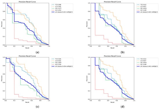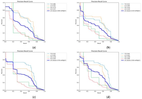 Figure 12a (Precision–Recall curve for RGB images) reveals that the TC and LC categories exhibited higher recall, which is likely due to their dominant representation in the dataset.