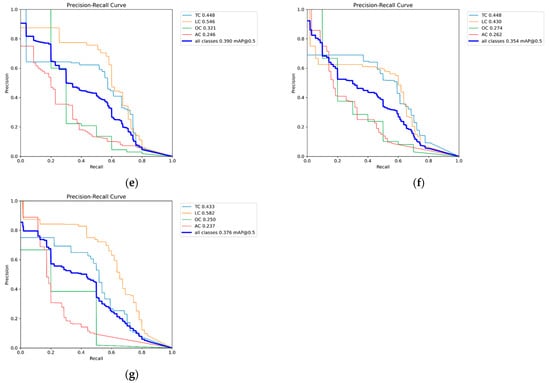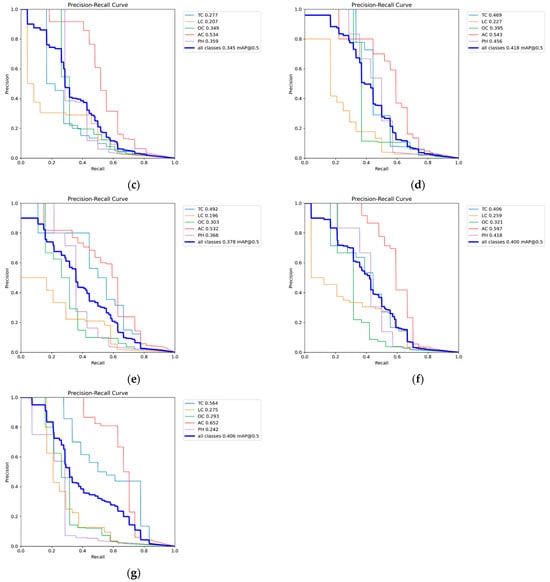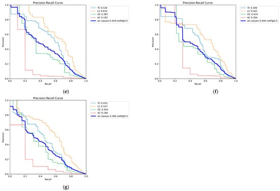 Precision–Recall curve of Crack500 dataset. (a) Precision–Recall curve for RGB images, (b) Precision–Recall curves for Average Method grayscale images, (c) Precision–Recall curves for Green Channel Method grayscale images, (d) Precision–Recall curves for Maximum Value Method grayscale images, (e) Precision–Recall curves for Minimum Value Method grayscale images, (f) Precision–Recall curves for Weighted Average Method grayscale images, (g) Precision–Recall curve for binarized images.