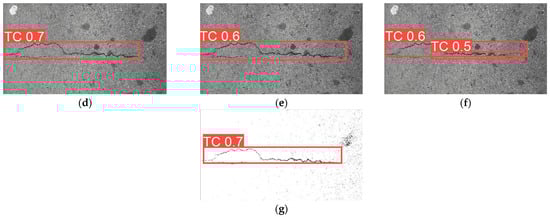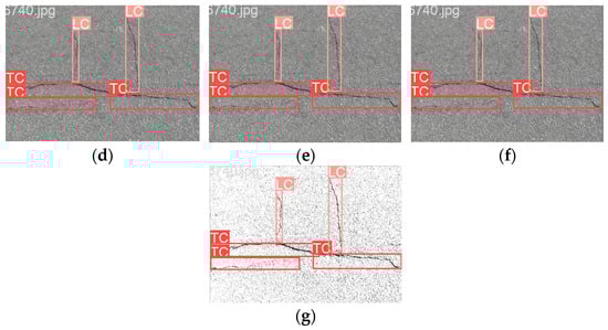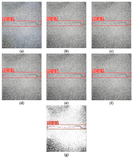 These findings highlight that dataset imbalance significantly affects model performance, which led to higher recall for majority classes while minority classes suffered from lower detection accuracy. This suggests that dataset balancing strategies such as data augmentation or reweighting loss functions could be beneficial for improving model generalization across all crack types. Figure 13 presents sample detection results from the Crack500 dataset. Subfigure (a) shows the detection result using RGB images, (b–f) illustrate the results from different types of grayscale images, and (g) displays the result when using binarized images.