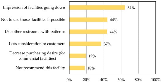 Figure 3 presents survey responses to the question ‘How comfortable do you feel using public restrooms?’. Participants, aged 20 to 60, included 80 respondents per sex per age group (totalling 800 respondents). Multiple answers were allowed [].