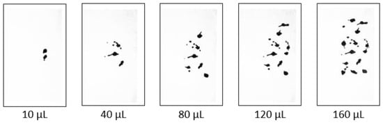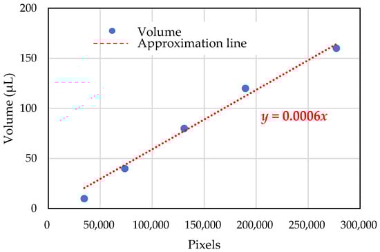 Figure 4 displays images of water droplets placed using a digital pipette. The relationship between the number of pixels representing the water droplets and the corresponding volume was determined before the experiments, as shown in Figure 5. This relationship is approximated as linear.