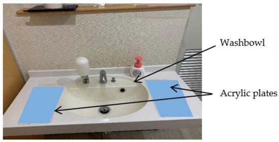 To collect water droplets around the washbowl, acrylic plates were placed on either side of the washbowl and replaced every hour for analysis. Figure 8 shows the actual setup, with transparent acrylic plates used in the experiment. The plates were colour-coded blue in the figure for better visibility.