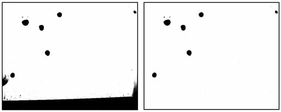 Captured bitmap image of water droplets taken at 10:30 on the first day of the experiment at male restroom (left) and the processed image after removing irrelevant black areas (right).