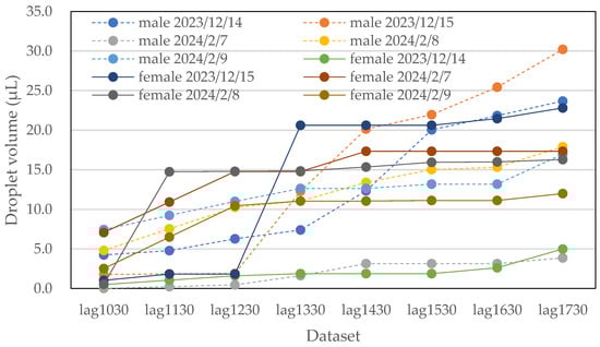 Five-day data from male (dashed lines) and female (solid lines) restrooms, converted to water droplet volume data.