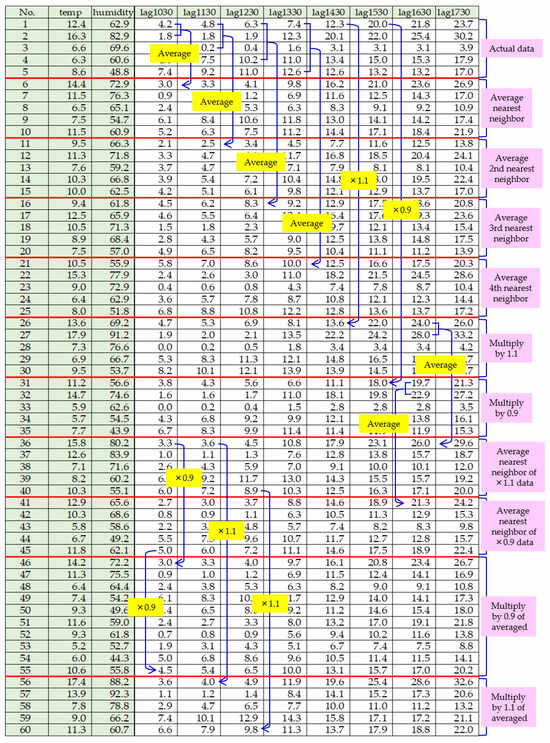 Details of the first method, involving averaging and scaling, are illustrated in Figure 14. This method resulted in a total of 60 datasets: five original datasets (data No. 1–5) and 55 augmented datasets (data No. 6–60). Each augmented dataset also included the average temperature and humidity for the day, obtained from a meteorological agency. In Figure 14, data No. 6 represents the average of data No. 1 and data No. 2, including temperature and humidity averages. Similarly, data No. 11 is the average of data No. 1 and data No. 3, and so on. By successively taking averages with two nearest neighbours, two second-nearest neighbours, and so on, we generated 20 augmented data points from the original five datasets.