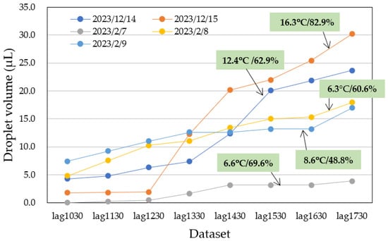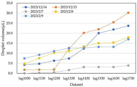 The collected data on water droplet volumes exhibited significant variation, depending on individual usage, as shown in Figure 13. On some days, there were abrupt changes in droplet volumes in response to time variations. However, as the number of data points increased, this variation became less pronounced. Generally, the data indicated a tendency for the accumulated water droplet volume to increase with the number of restroom users. It is important to note that ventilation fans were continuously running in the restrooms, which led to the evaporation of water droplets over time. As a result, the observed water droplet volumes were slightly lower than the actual volumes, implying that the prediction may be somewhat underestimated.