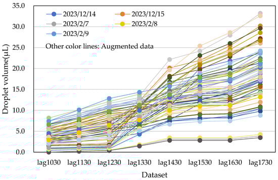 Ultimately, three augmented datasets were prepared: (1) the averaging and scaling method, including temperature and humidity, (2) the averaging and scaling method without temperature and humidity, and (3) the random number generation method. These datasets were then used to predict water droplet volumes, and the accuracy of the prediction methods was evaluated.