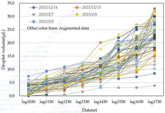 Next, data No. 26 and data No. 27 were obtained by multiplying data No. 1 and data No. 2 by 1.1, respectively. Similarly, data No. 31 and data No. 33 were multiplied by 0.9. This step provided an additional 10 augmented datasets. The process was repeated by averaging the new data points, resulting in a total of 60 datasets. Figure 15 and Figure 16 show the actual water droplet data from the male restroom (Figure 13) and the augmented data from the male restroom, respectively.