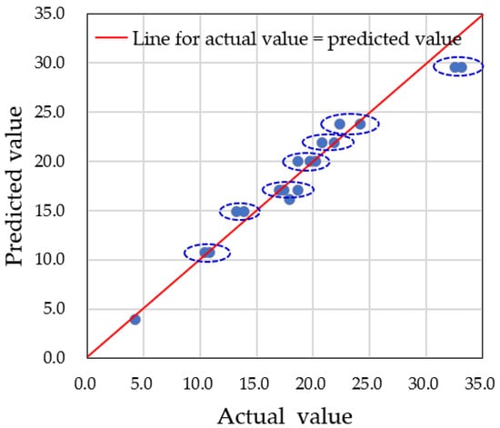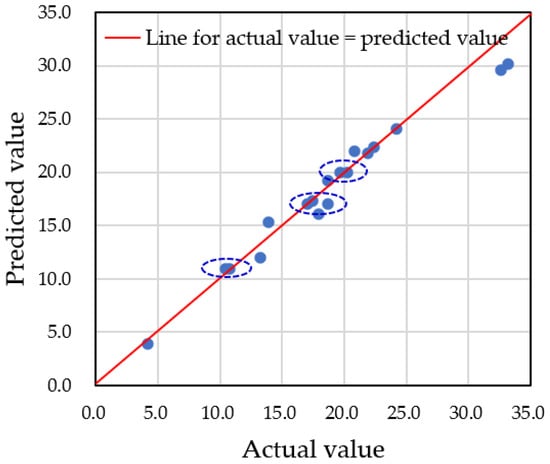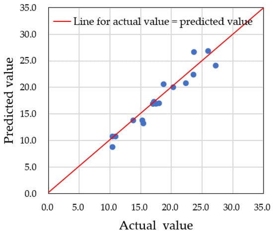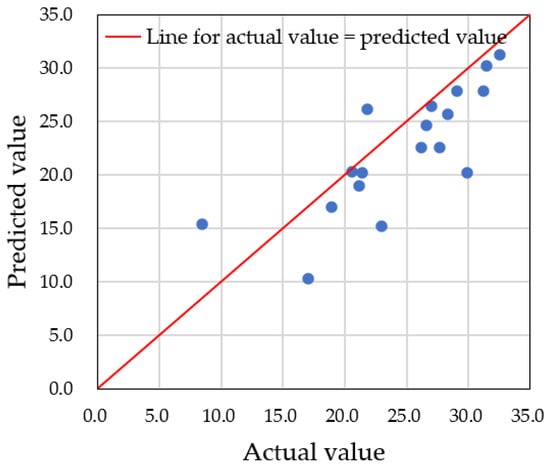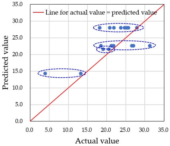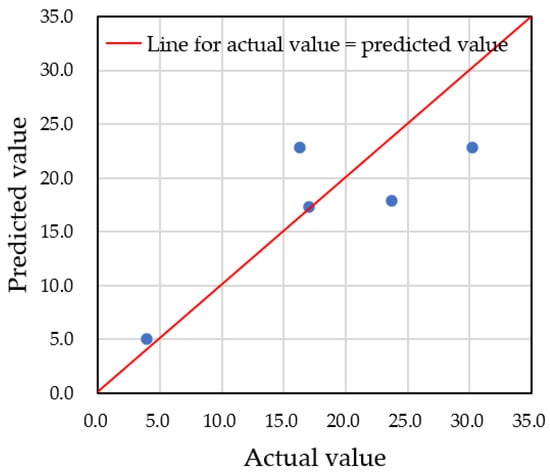 First, we present the results of predictions made using only the actual datasets obtained from the in situ experiment. There were five datasets for each sex, but since this number is too small to construct a reliable prediction system with the LightGBM framework, we combined the datasets without considering gender in order to evaluate the accuracy of the prediction system. In this case, the hyperparameters were set as follows: 50% of the data (5 out of 10 datasets) was used for training, while the remaining 50% (5 out of 10) was used for testing. The decision tree depth (max_depth) was set to 9, and the random_seed was fixed. Figure 18 presents a comparison between the predicted and actual values. The results show an R2 value of 0.656 and a root mean squared error (RMSE) of 5.137, indicating relatively poor prediction accuracy due to the limited dataset. To improve accuracy, it was clear that augmented datasets, as described in Section 3.3, would be necessary.