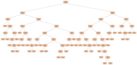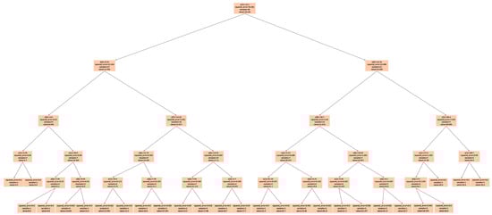 For max_depth = 3 (Figure 19), the model grouped multiple actual data points into a single predicted data point, resulting in four incorrect predictions. The decision tree diagram for this case, with only three nodes, is shown in Figure 22. When max_depth was increased to 5 (Figure 20), seven incorrect predictions occurred, indicating insufficient classification. With max_depth = 9 (Figure 21), only three incorrect predictions were made, with a more suitable distribution of nodes. Decision tree diagrams for max_depth values of 5 and 9 are shown in Figure 23 and Figure 24, respectively. Based on these results, we determined that a max_depth of 9 provided the most accurate predictions and should be adopted depending on the number of test cases.