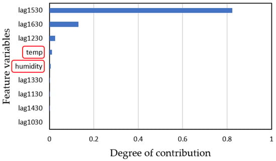 Photographs of water droplets on the acrylic plates were captured at 1 h intervals, and the data were accumulated into ‘1 h before’ datasets. These images were collected over five days from both male and female restrooms. The data are presented in Figure 13 and Table 2. The variables lag1030 through lag1730 represent data collected at hourly intervals from 10:30 to 17:30. Additionally, the average temperature and humidity were recorded, as shown in Table 2.