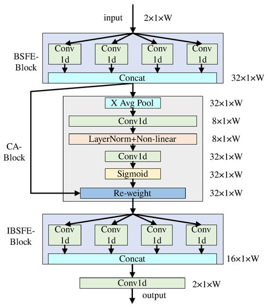 Figure 4. The BE-block consists of the BSFE-Block, CA-Block, and IBSFE-Block. The BSFE-Block denotes block sparsity feature extraction, IBSFE-Block denotes inverse block sparsity feature extraction. The BSFE-Block consists of 4 sets of convolutional kernels (each with sizes of 1 × 7, 1 × 15, 1 × 23, 1 × 31), where each set of kernels expands the 2-channel data to 8-channel data. X Avg Pool represents average pooling along the horizontal dimension. Conv1d denotes reducing the number of channels to decrease computational complexity. LayerNorm+Non-linear indicates layer normalization and non-linear operations. Re-weight represents matrix multiplication with the obtained sparse matrix. The IBSFE-Block is symmetrically structured with the BSFE-Block.